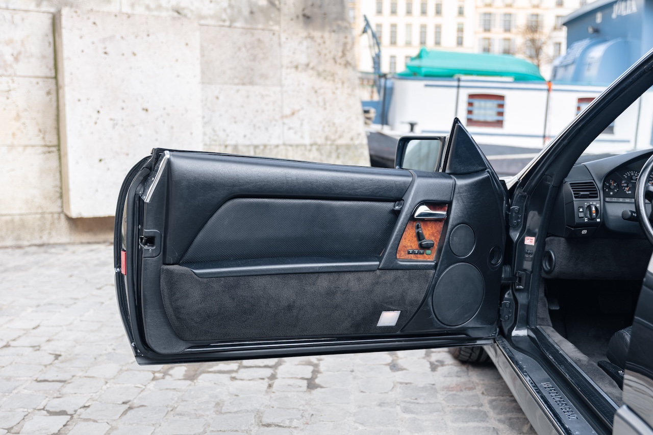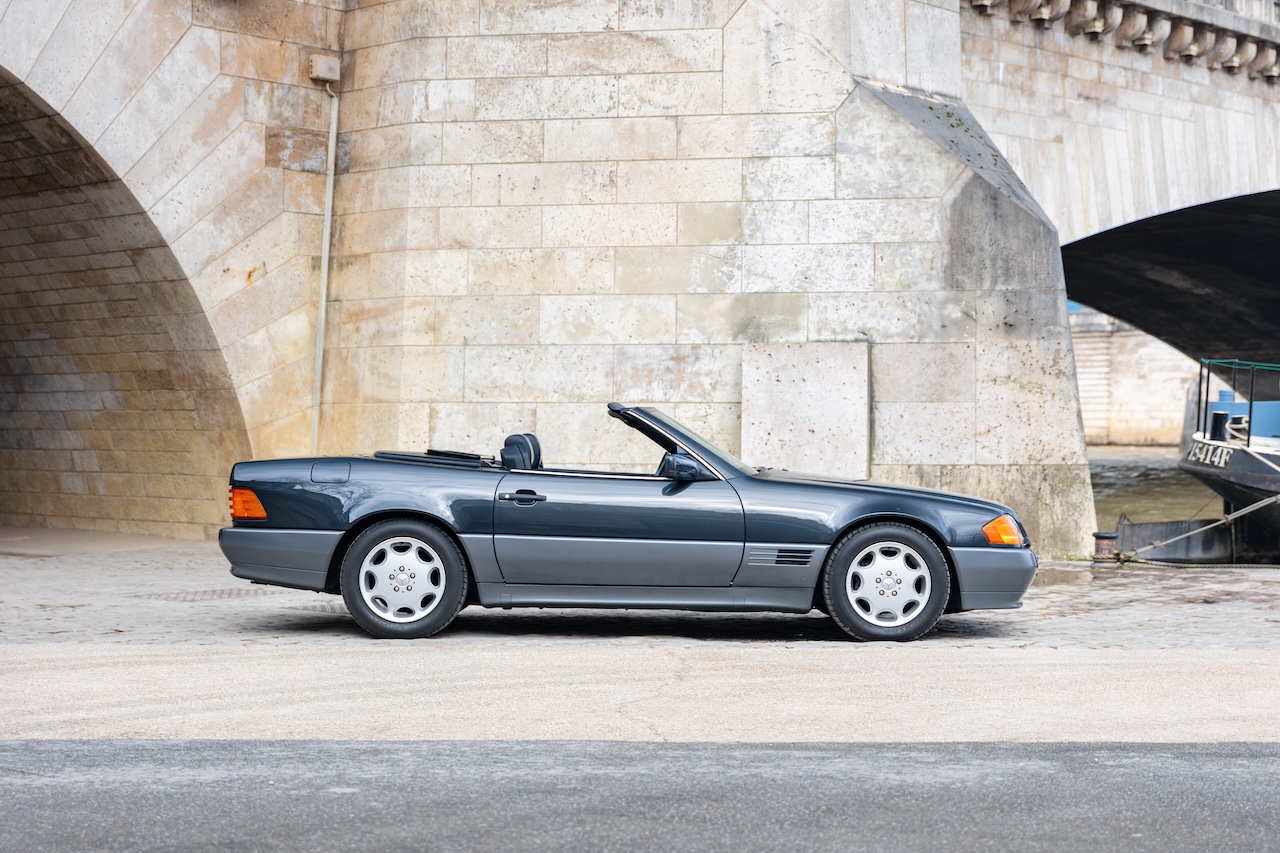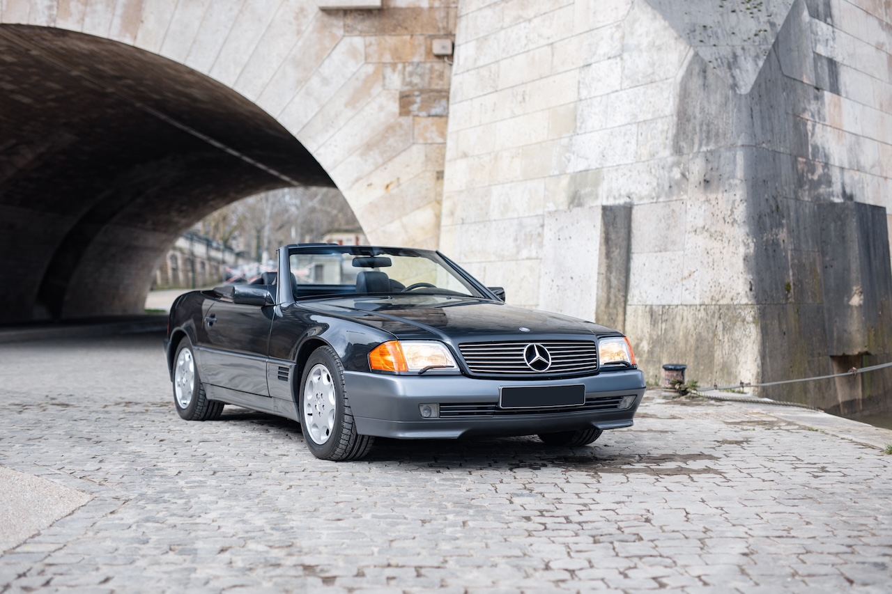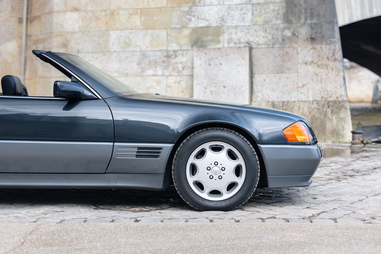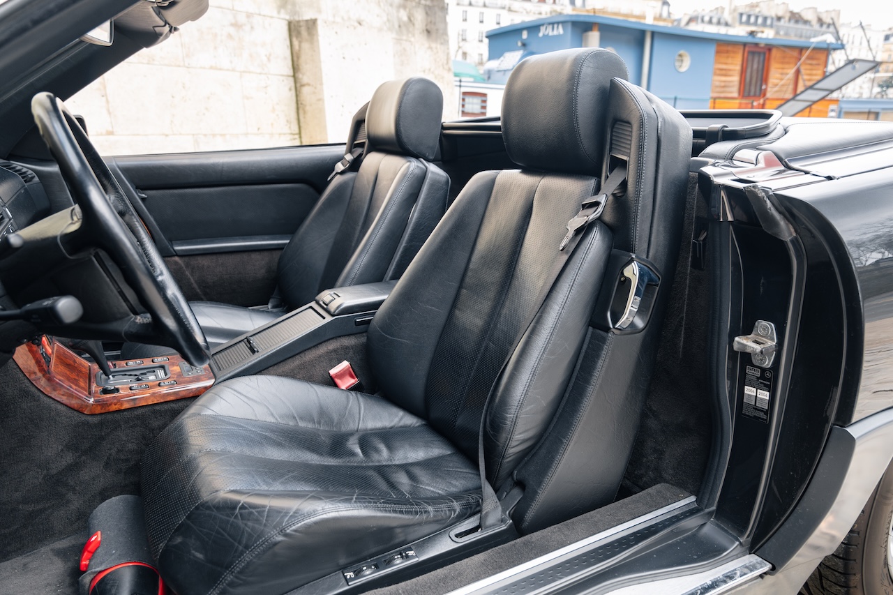 L’auto proposée est un 500 SL de 1991, en phase 1, reconnaissable à ses clignotants oranges, pare choc et bas de caisse mats, … Ce 500 SL a été livré neuf en Allemagne ou il passera quasiment toute sa vie avant d’être importé en France il y a 3 ans. La voiture est en très bel état de présentation. Elle n’a jamais été accidentée et seuls quelques éléments ont eu un voile de peinture. L’intérieur est en très bon état et surtout tout est fonctionnel : de la capote aux sieges éléctriques, en passant par le rétroviseur central électrique.