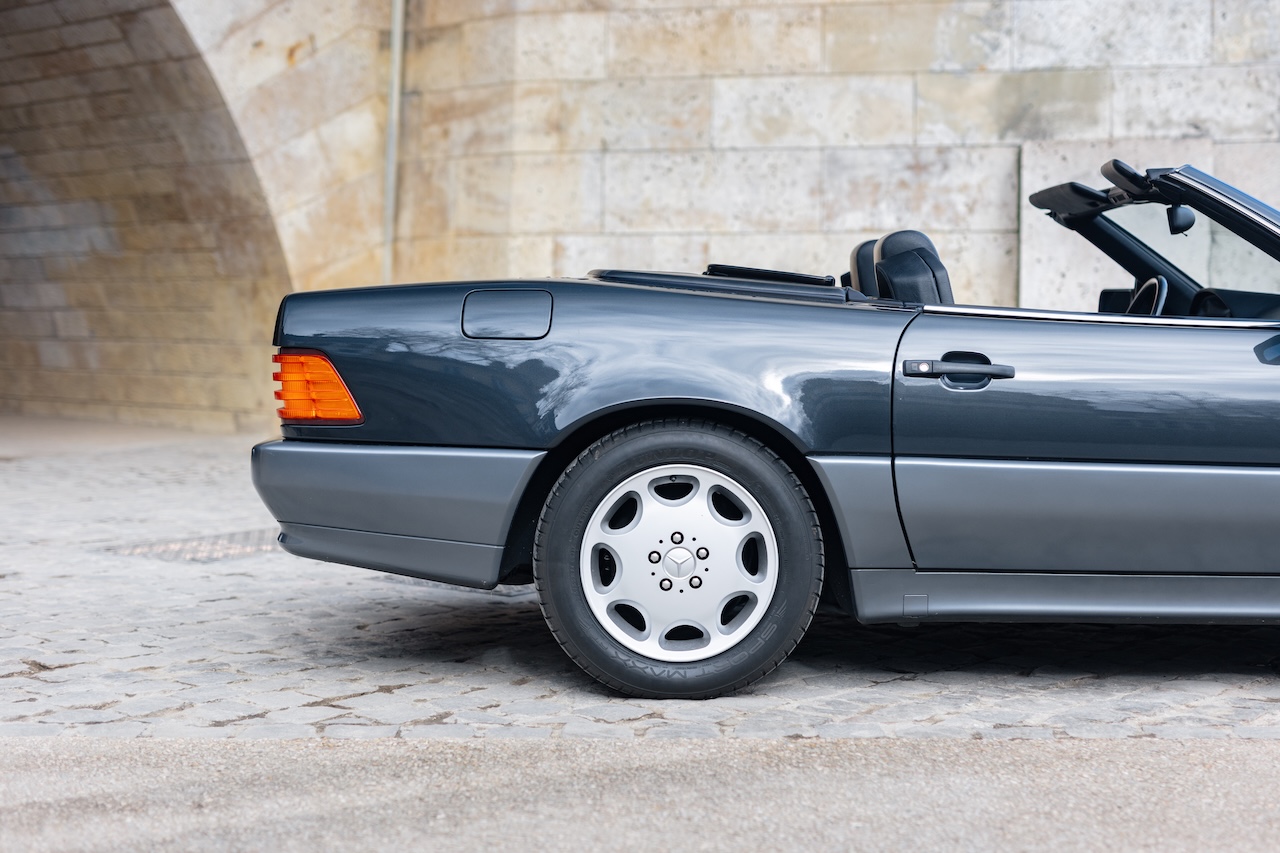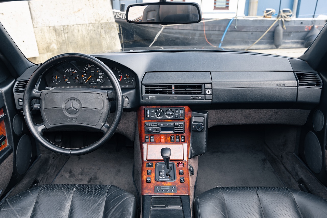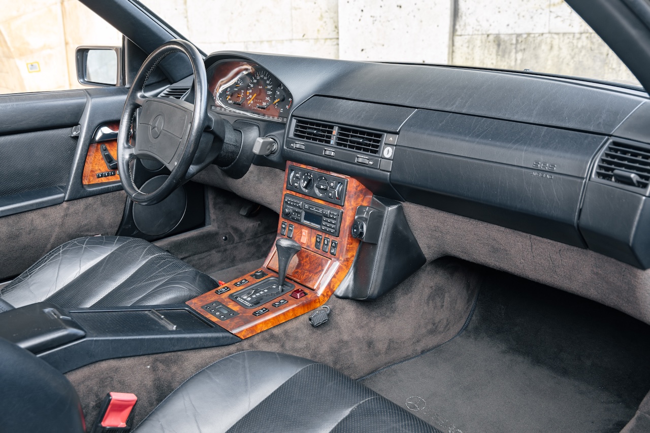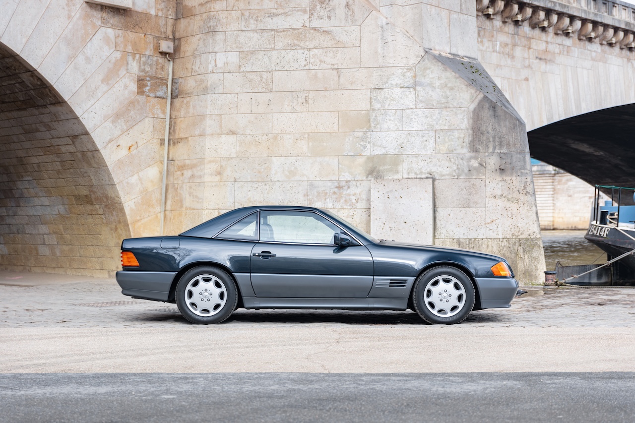 L’auto proposée est un 500 SL de 1991, en phase 1, reconnaissable à ses clignotants oranges, pare choc et bas de caisse mats, … Ce 500 SL a été livré neuf en Allemagne ou il passera quasiment toute sa vie avant d’être importé en France il y a 3 ans. La voiture est en très bel état de présentation. Elle n’a jamais été accidentée et seuls quelques éléments ont eu un voile de peinture. L’intérieur est en très bon état et surtout tout est fonctionnel : de la capote aux sieges éléctriques, en passant par le rétroviseur central électrique.