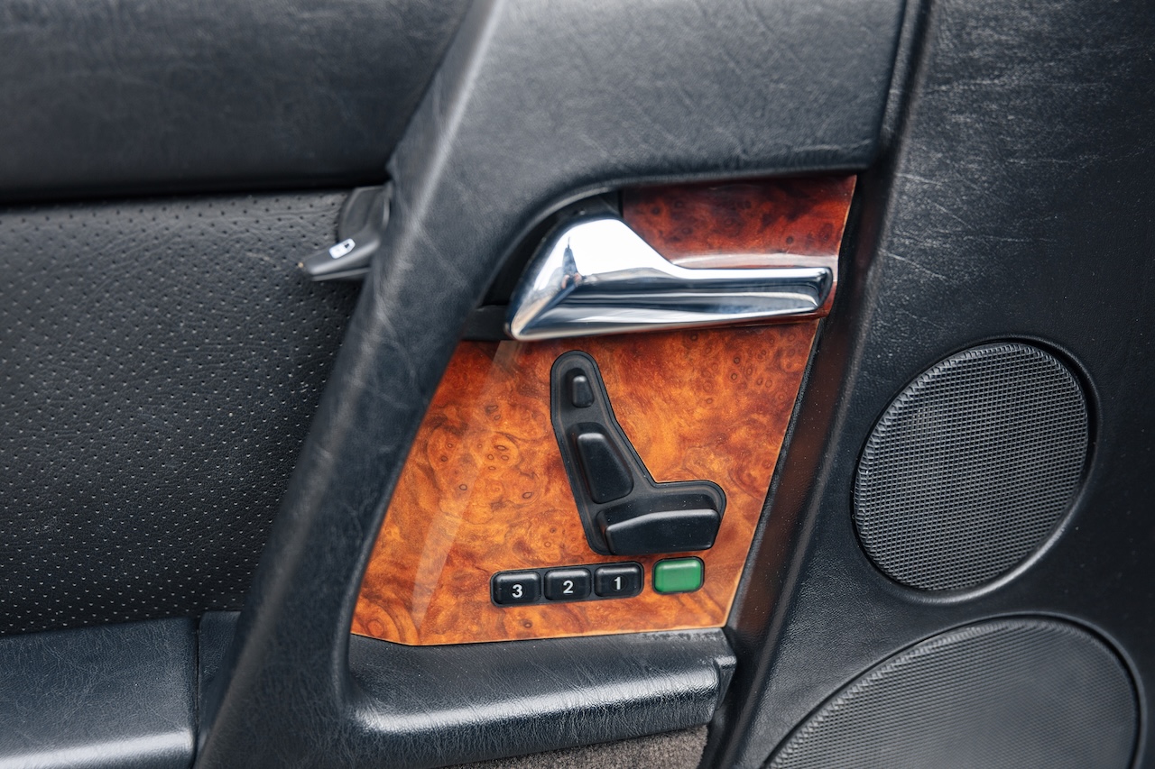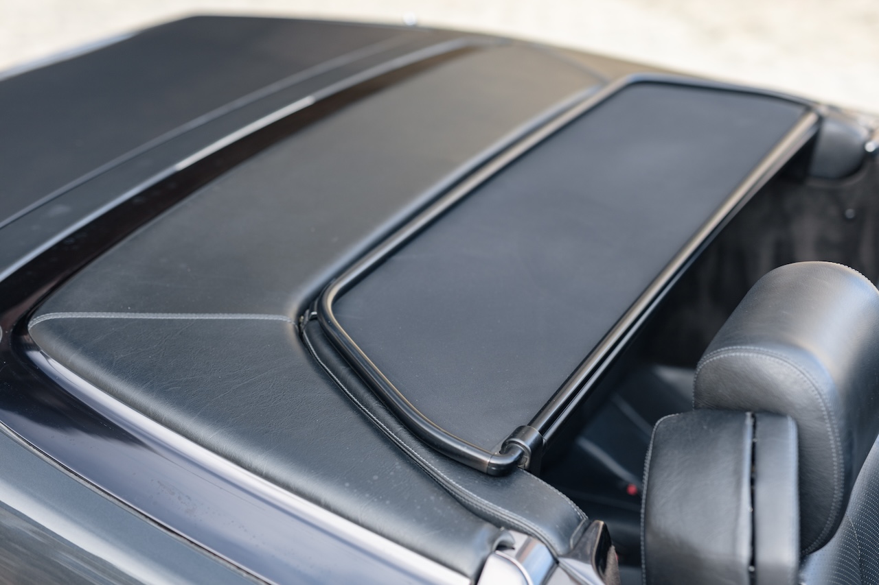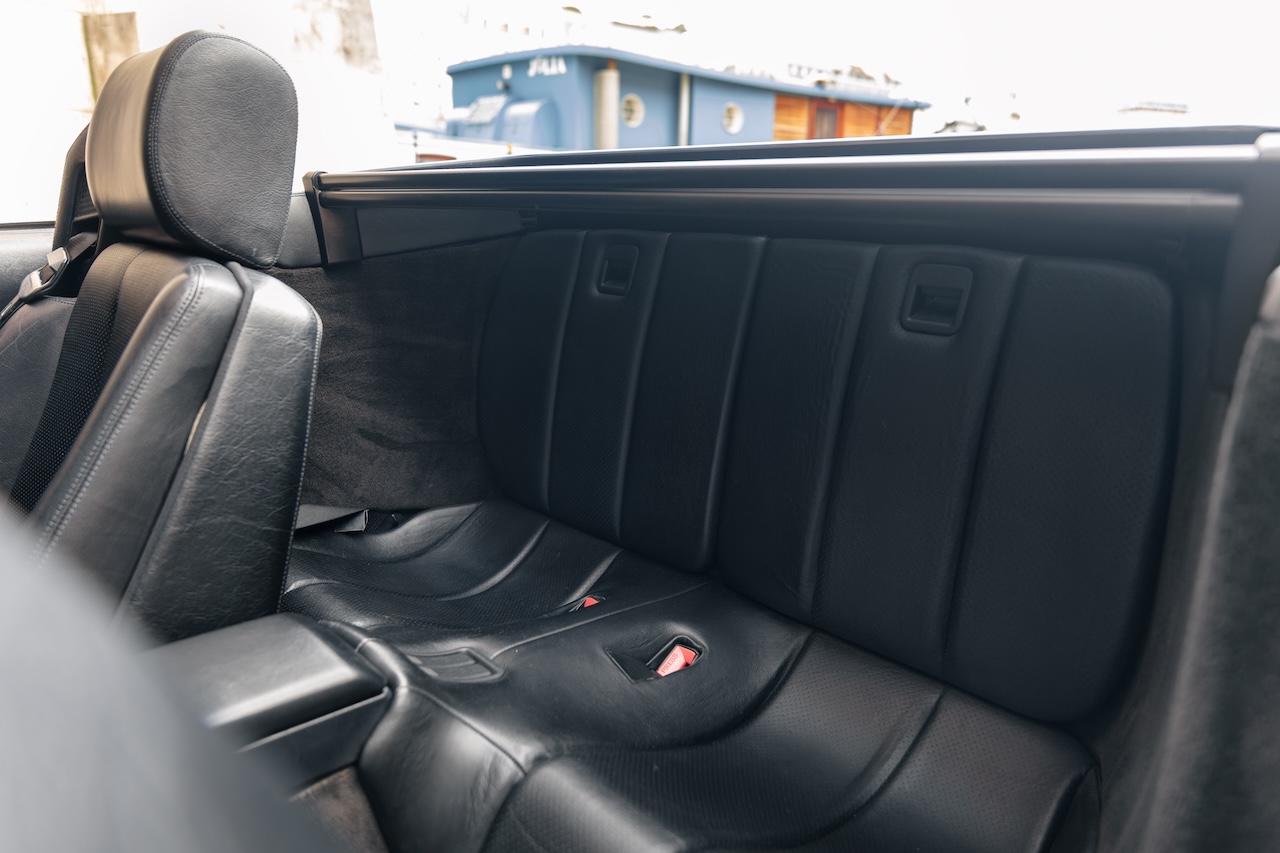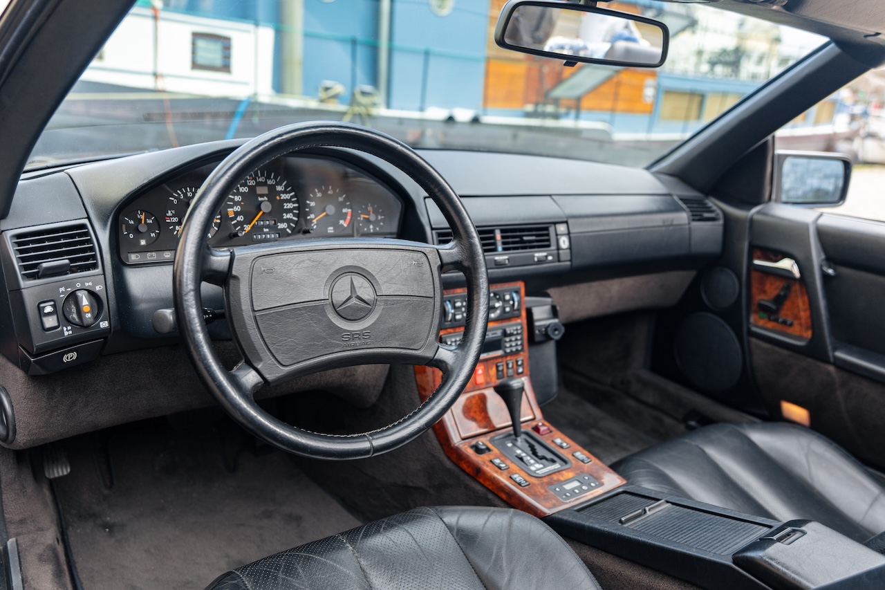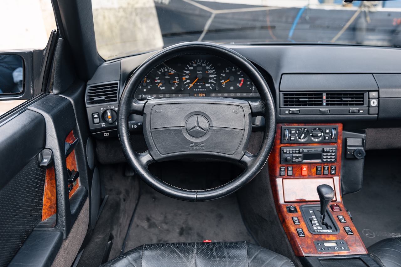 L’auto proposée est un 500 SL de 1991, en phase 1, reconnaissable à ses clignotants oranges, pare choc et bas de caisse mats, … Ce 500 SL a été livré neuf en Allemagne ou il passera quasiment toute sa vie avant d’être importé en France il y a 3 ans. La voiture est en très bel état de présentation. Elle n’a jamais été accidentée et seuls quelques éléments ont eu un voile de peinture. L’intérieur est en très bon état et surtout tout est fonctionnel : de la capote aux sieges éléctriques, en passant par le rétroviseur central électrique.