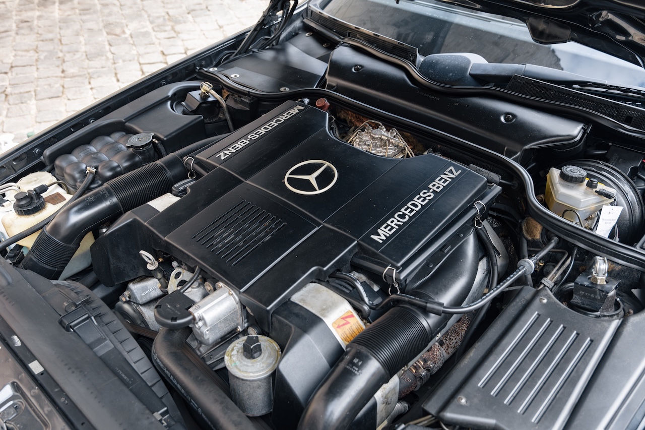 Pour un si bel écrin, il faut de la belle mécanique sous le capot étoilé. Si l’Allemagne à droit à une version 300 SL dotée d’un 6 cylindres de 3 litres développant 180 ch, avec boîte mécanique de série, la France n’importe en entrée de gamme que la 300-24 SL, équipée du même moteur avec une culasse à 24 soupapes développant 231 ch. La puissance développée n’est pas de trop pour mouvoir rapidement les 1760 kg Mercedes. Mais le must alors présenté en 1989 sous le capot du SL est le gros V8 Mercedes de 5 litres développant 326 ch. Uniquement accouplé en boîte auto 4 rapports, il permet au SL de briller au chapitre des performances et de se faire une place parmi les GT performantes ; les 250 km/h sont atteints et il faut moins de 27 secondes pour franchir un kilomètre départ arrêté. Toutefois, si l’efficacité et les performances sont là, la facilité de conduite et le confort du 500 SL le fait plus appartenir à la catégorie des GT que des sportives. Et, malheureusement, le V8 est fort discret pour nos oreilles. En 1992, Mercedes complète sa gamme SL vers le haut : le 600 SL. Avec son V12 de 6 litres, il développe 395 ch. Performances et reprises au rendez-vous, mais le SL 600 frise les 2 tonnes. Cela se sent au volant, mais l’impression générale est évidemment excellente.